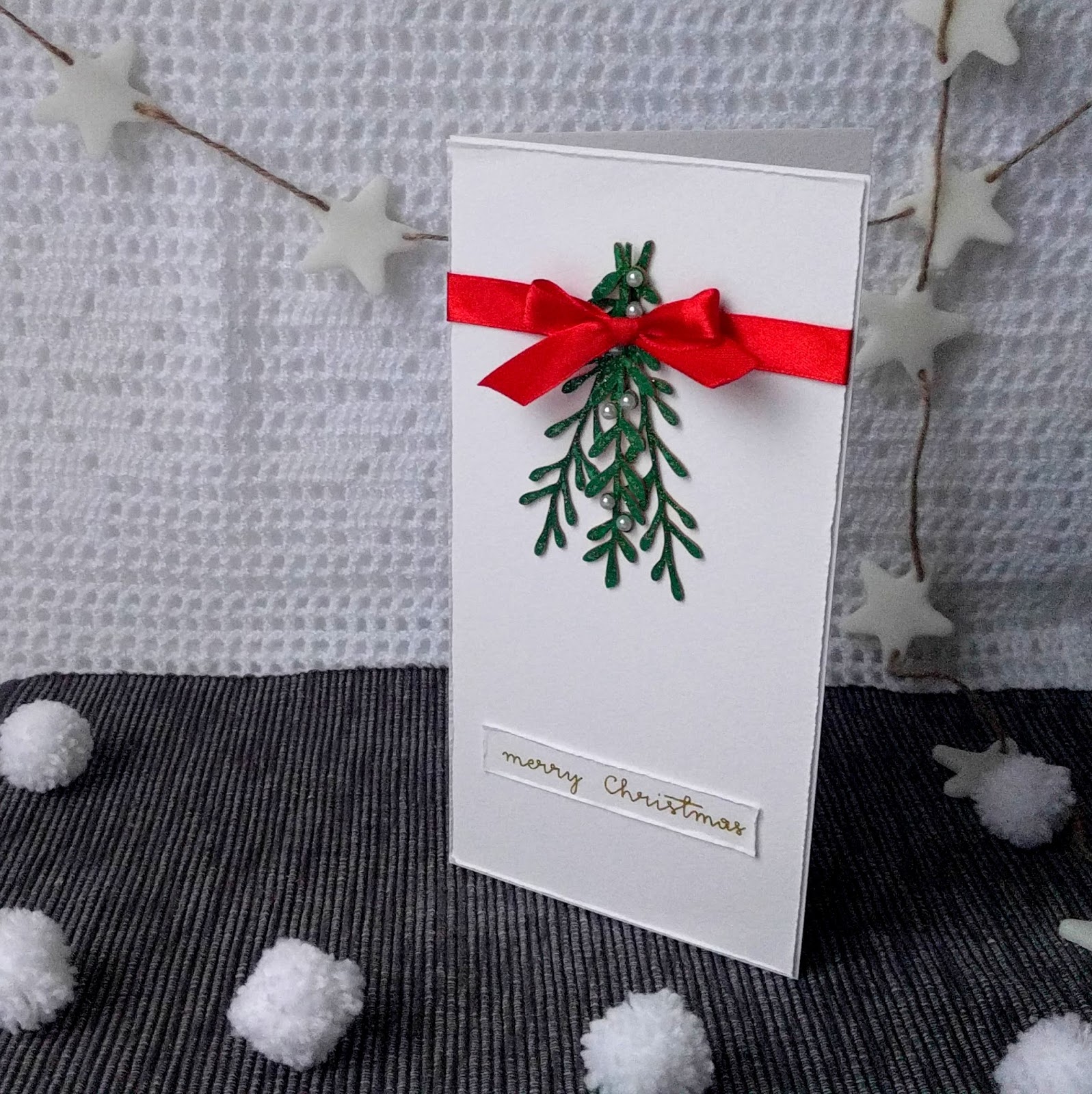 Brzegi papieru bazowego oraz papieru z napisem lekko postrzępiłam, aby forma nie była całkiem zwyczajna. Użyłam tekturek ze sklepu wycinanka.net. Srebrne motywy są ozdobione brokatem, a połączenie zieleni i czerwieni z dodatkiem złota to pomysł mojego męża. Właściwie to on wymyślił kartkę z choinką, a że to połączenie kolorów bardzo mi się spodobało, to wykorzystałam je w kartce z jemiołą.